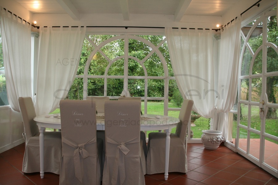 Piano terra: sala TV, cucina, sala da pranzo, salone , camera doppia, bagno con doccia, cameretta con bagno, terrazza coperta con tavolo da pranzo e vista sul giardino .